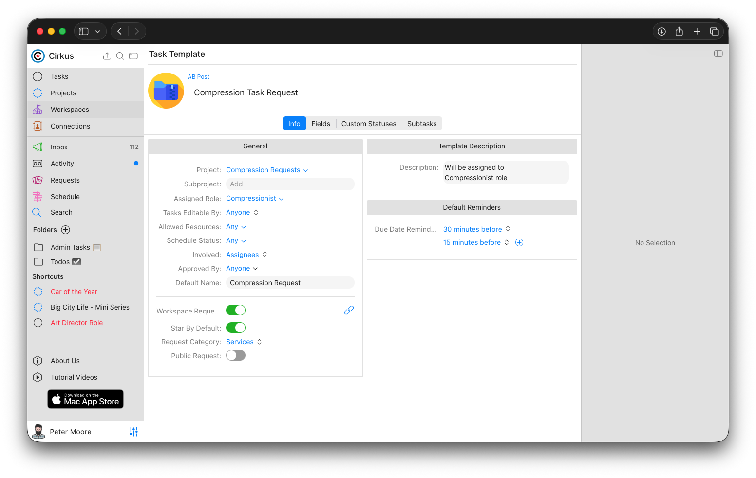 Templates are configured and made available by administrators of a Workspace. Task templates allow you to set up custom fields on tasks. You can set up single or multiline fields, date fields, filepath, checkboxes, or selector entries. The grouping and label fields help to format the task, and guide the task creator. You can also choose who can see these fields and if they are mandatory based on certain conditions. Also, you can choose which project the task will be created in, who can edit the task after it’s created and setting default assignees.