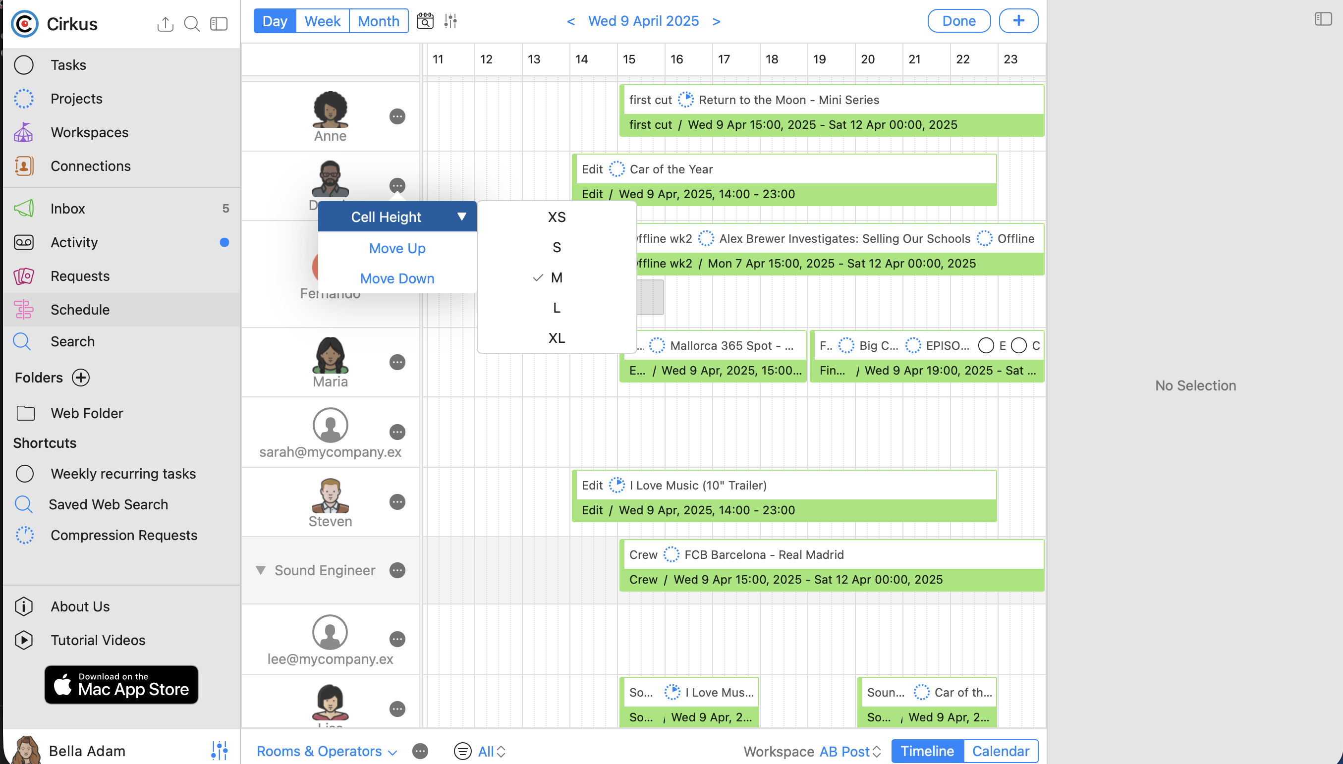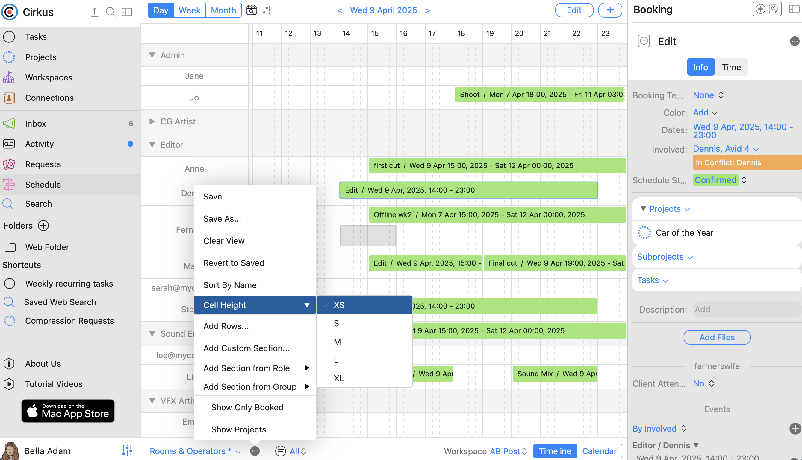 In the Cirkus Mac and Web applications you can choose to expand and collapse the left menu or Inspector views, to give more space to see your schedule.