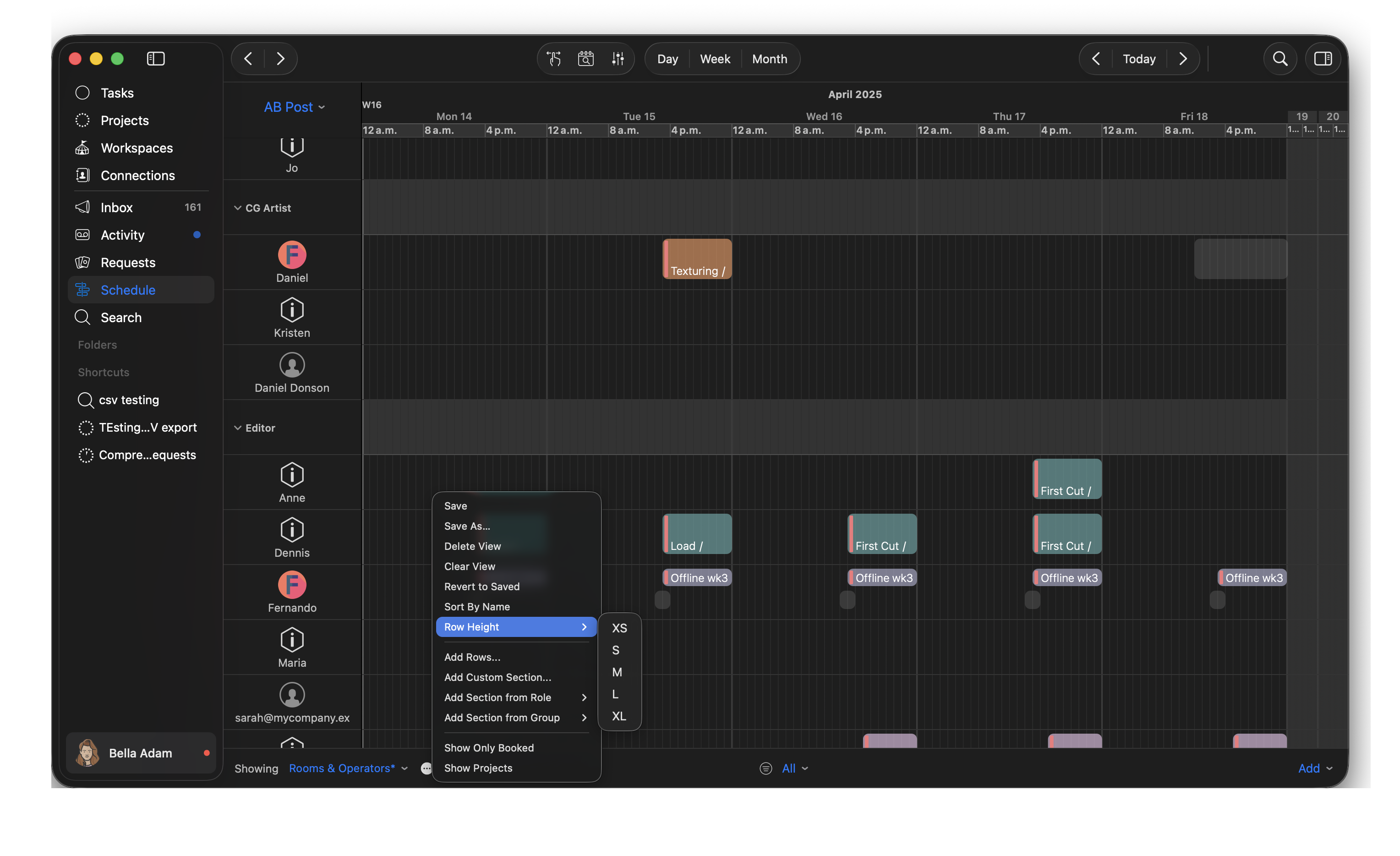 On Cirkus mac app, changes can be made in the schedule by right click contextual menu actions on single or multiple rows or sections, or dragging and dropping them in the view.
