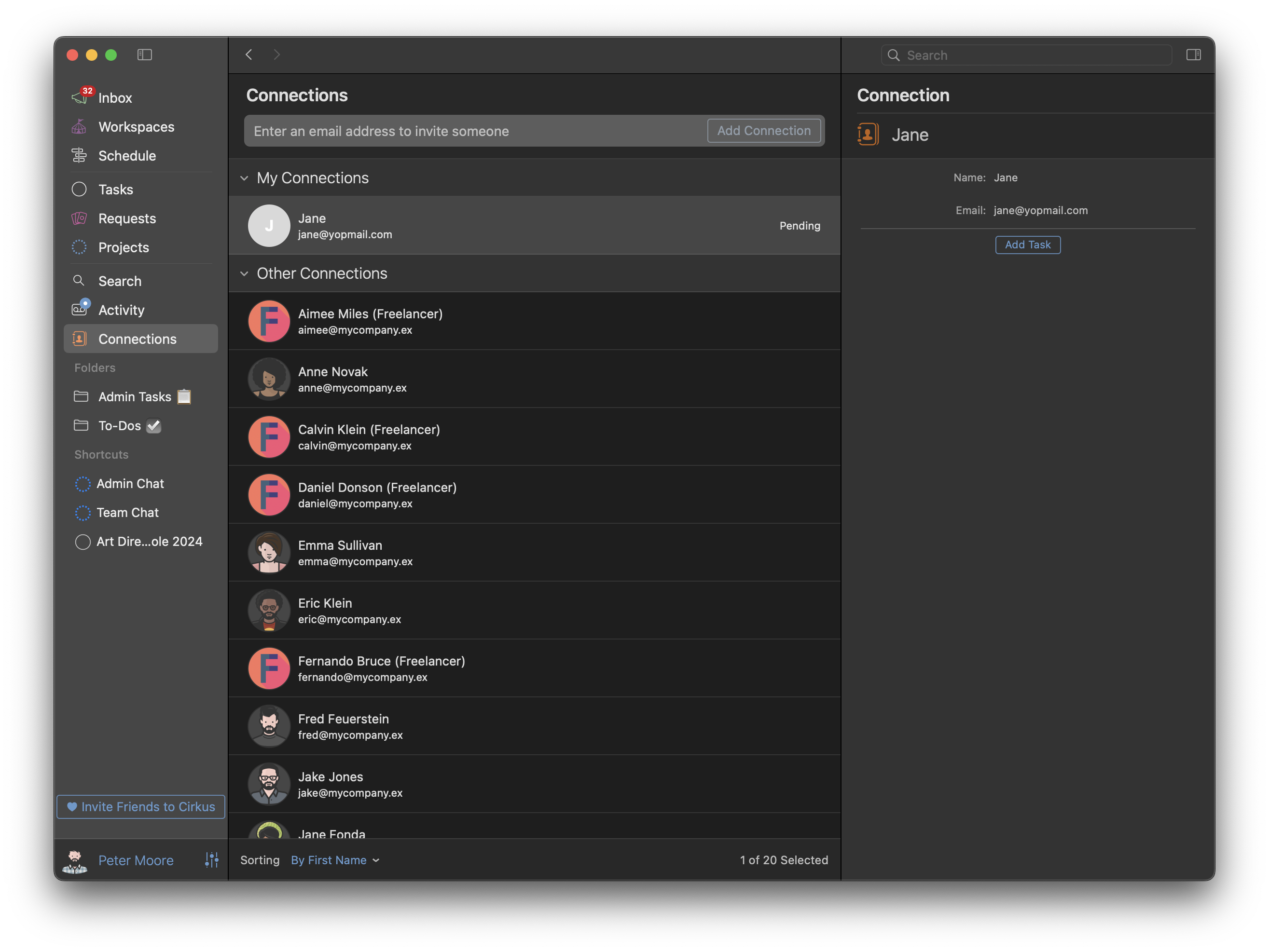 When you assign a task, or invite users to a project, suggestions from your Connections list are presented for you to easily pick them.