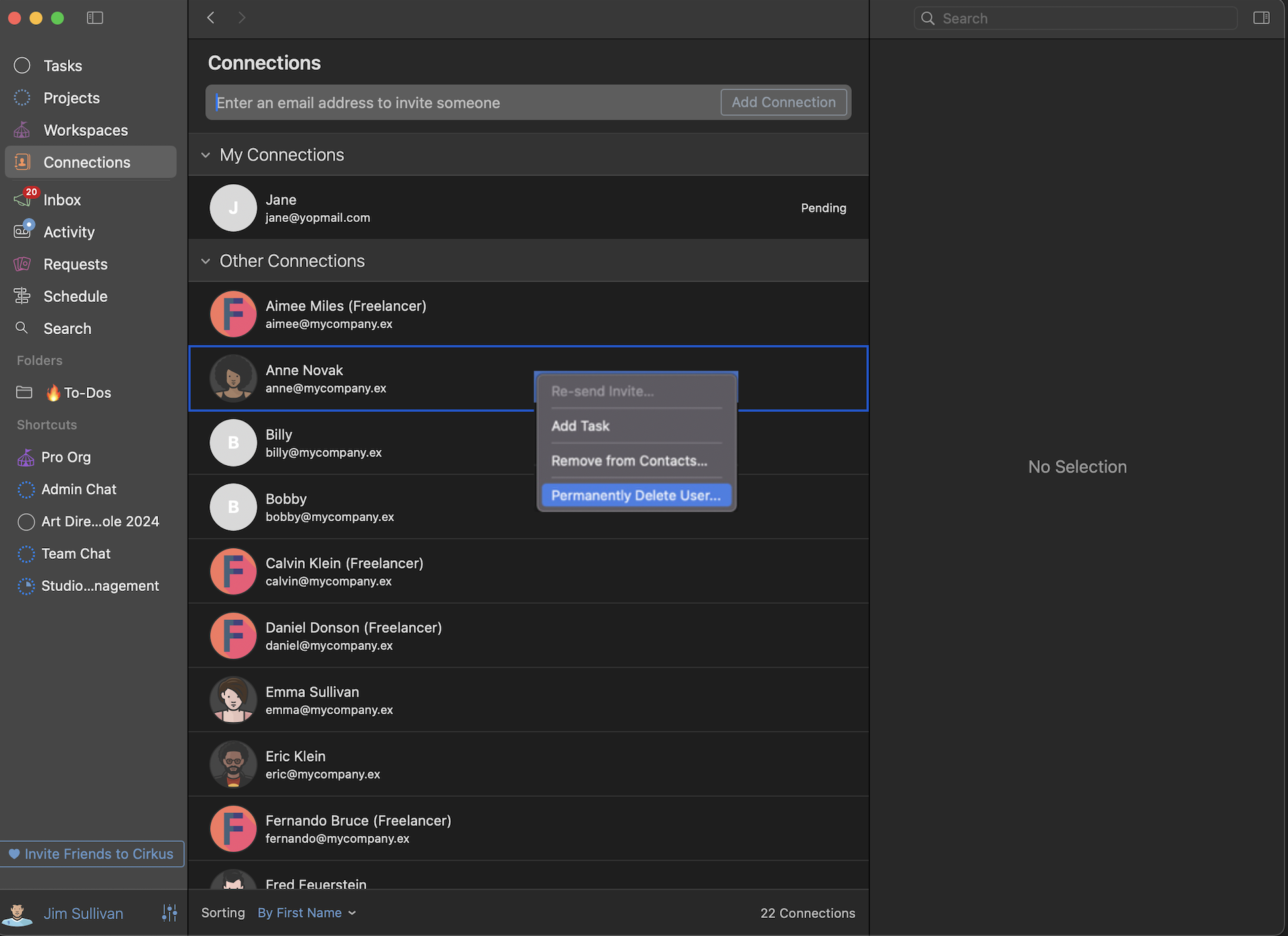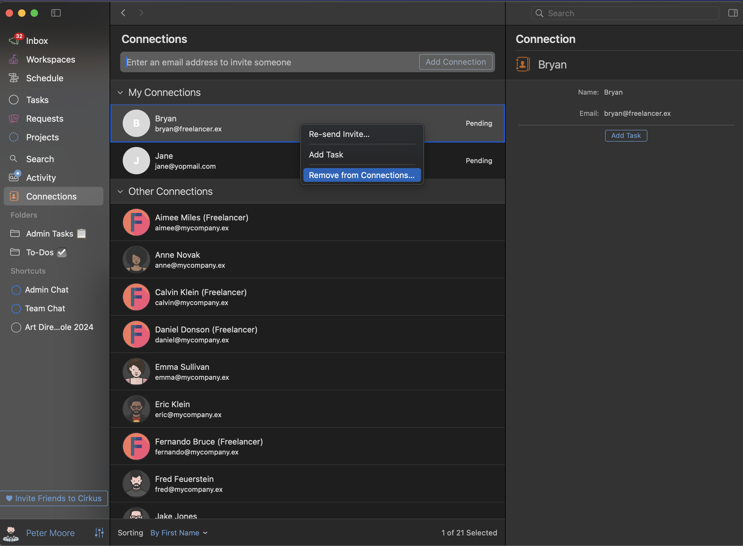 Note, this only affects your own list, it does not remove them from Cirkus, or any shared workspace or projects.