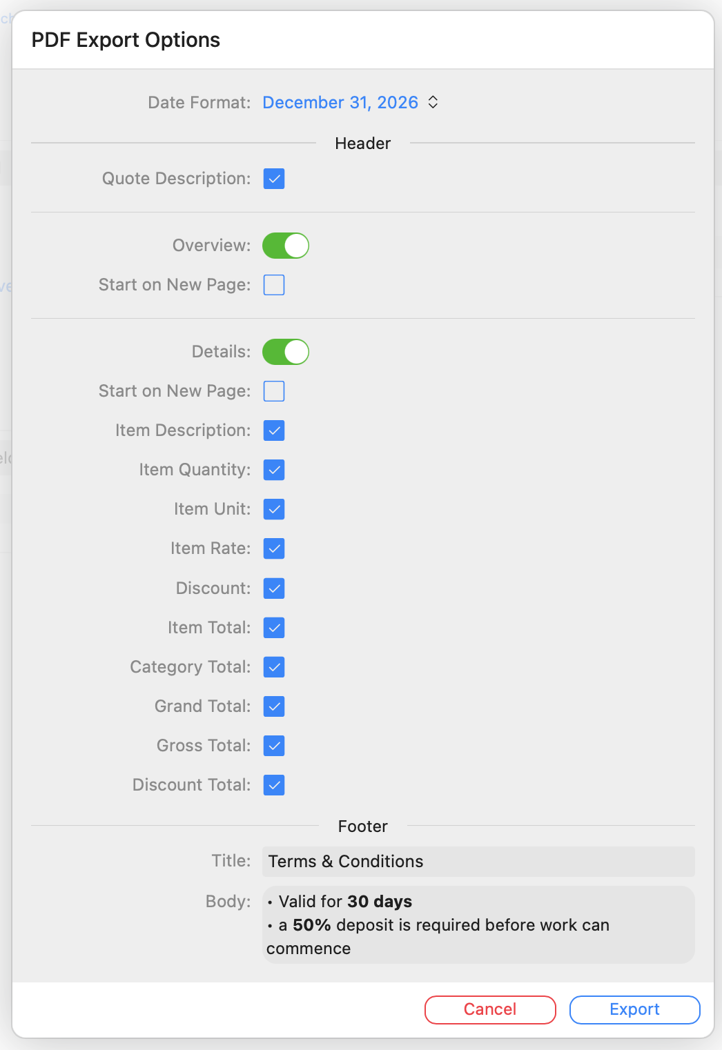 Page breaks can be inserted between sections — this can be configured in the Export to PDF dialog or set as a default in Workspace > Quote Settings.